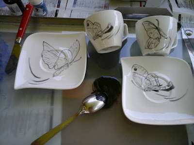 Un premier essai de peinture sur porcelaine avec le thème du moment... cuisson à 800°C... du solide quoi ! Tasses, assiettes et plat de service. Plaisant comme activité.
